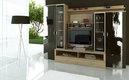 Гостиная EMILI Гнутые фасады мебели для гостиной комнаты EMILI - все для того, чтобы вам завидовали. Двери шкафов изготовлены из МДФ и покрыты глянцевой эмалью контратстного цвета.Современная мебель для гостиной в лучших немецких традициях. Тумба под телевизор любых габаритов, место под аппаратуру и удобные витрины с подсветкой.